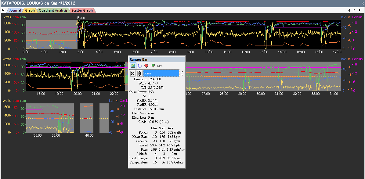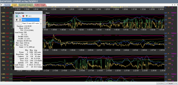 Παρακάτω παρουσιάζω από τον συγκεκριμένο αγώνα, ορισμένα εργομετρικά δεδομένα μου σε μορφή γραφημάτων, σύμφωνα με τα οποία θα κατανοήσετε καλύτερα, γιατί ένας αγώνας είναι προτιμότερος από μία επίπονη προπόνηση.