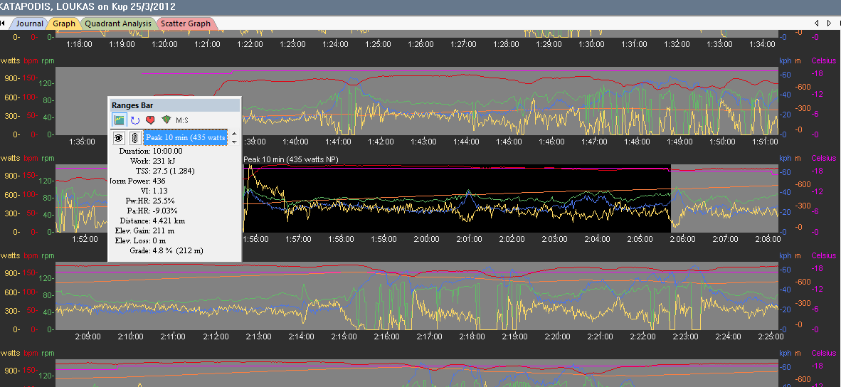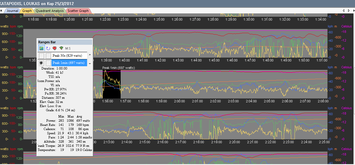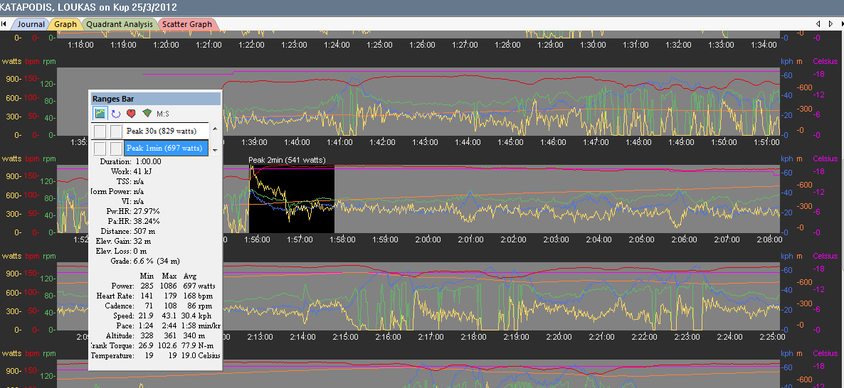 Για παράδειγμα, παρατήρησα ότι τα πρώτα 5sec του ντεμαράζ που έκανα, είχαν την δύναμη ενός πολύ καλού δυνατού μου σπριντ, αλλά αυτό δεν με φρενάρησε στο να συνεχίσω και να περάσω το πιο δυνατό μου μονόλεπτο και στη συνέχεια να πραγματοποιήσω το καλύτερό μου 2λεπτο, 5λεπτο,10λεπτο και τέλος το 19λεπτο (αναφέρω 19λεπτο αντί για 20λεπτο διότι είχα ήδη πιάσει την πρώτη μεγάλη κατηφόρα της διαδρομής).