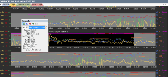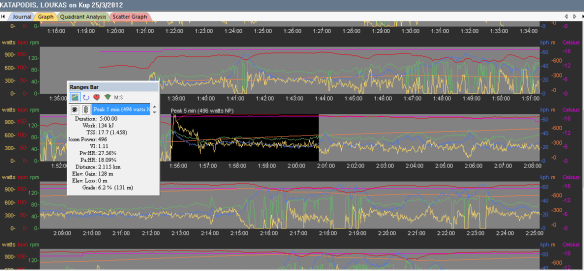 Στο γράφημα 5 & 6 βλέπετε την Ικανότητα της Ισχύος μου στα 5 και 10 πρώτα λεπτά της προσπάθειας, η οποία φθάνει αντίστοιχα τον μέρο όρο των 496w & 436w NP, αναδεικνύοντας μια άριστη Μέγιστη Ικανότητα Πρόσληψης Οξυγόνου.
