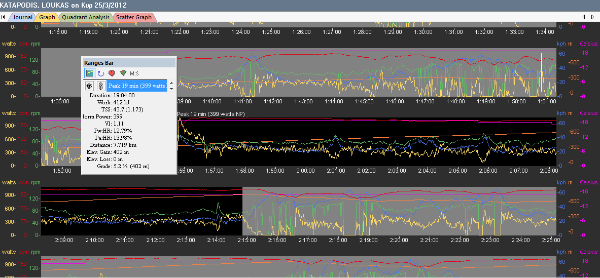 Στο γράφημα 7. η μέση Ισχύς μου στη διάρκεια του 19λεπτου ανέρχεται στα 399w NP δίνοντάς μου νέα δεδομένα για την αναθεώρηση της Ισχύος μου στο Αναερόβιο Κατώφλι.