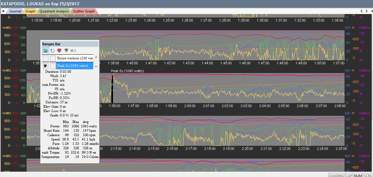 Στο γράφημα 1. φαίνεται η συνολική εικόνα της φυσικής μου κατάστασης με κύριο γνώμονα το μέσο όρο της ισχύος που εφάρμοσα στα 328w NP για 1h.52΄. Στην ουσία ποδηλάτισα στο 96.4% του Αναερόβιου Κατωφλιού μου για τον παραπάνω αντίστοιχο χρόνο και αυτό με τη σειρά του μεταφράζετε σε ένα πάρα πολύ καλό και αξιόπιστο Fitness για την εποχή.