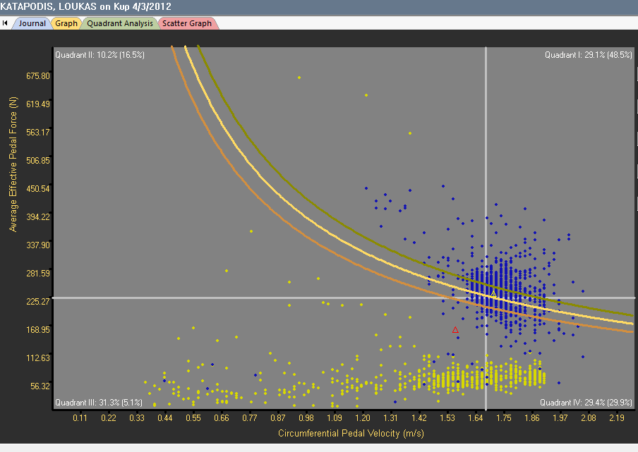 Μια συνολική εικόνα του ρυθμού μπορούμε να τη μελετήσουμε και από το Quadrant Analysis της WKO. Ο ρυθμός ενός ποδηλάτη για να είναι αποδοτικός στα αγωνίσματα της Ατομικής Χρονομέτρησης, θα πρέπει η κυρία μάζα της Ισχύος να μοιράζεται στο κέντρο και περισσότερο στα δύο πάνω τεταρτημόρια εξίσου το ίδιο.
