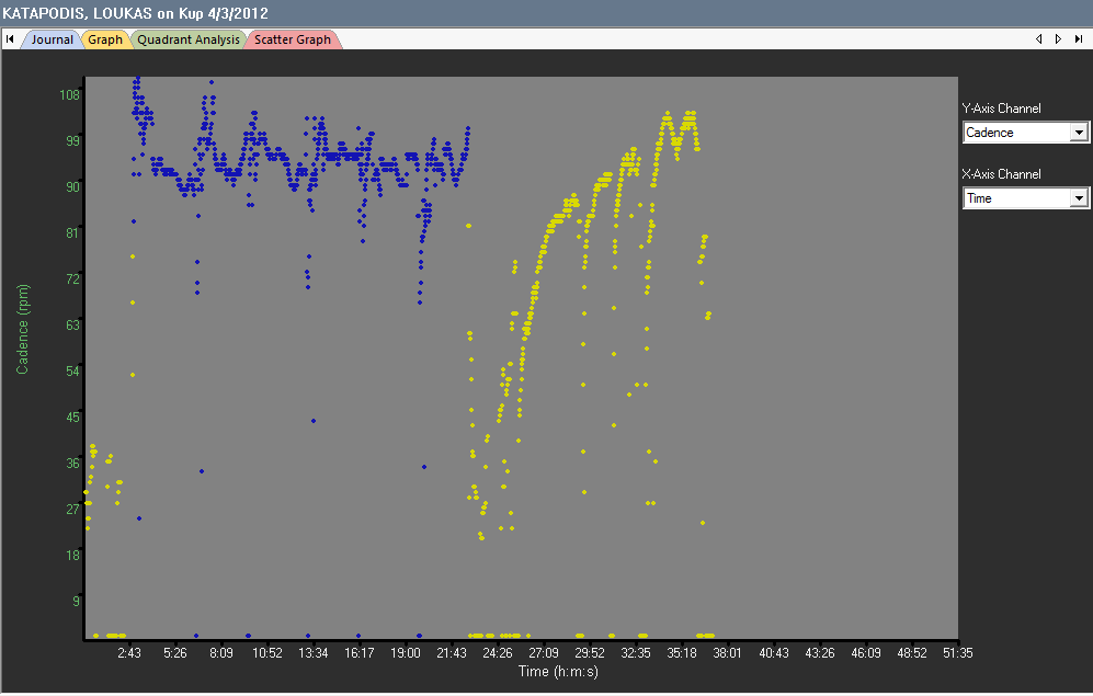 Διαπιστώνουμε ότι υπάρχει μια ισορροπία του ρυθμού πεταλαρίσματος ,σχεδόν πάνω από τις 90 περιστροφές το λεπτό καθόλη την διάρκεια του αγωνίσματος.