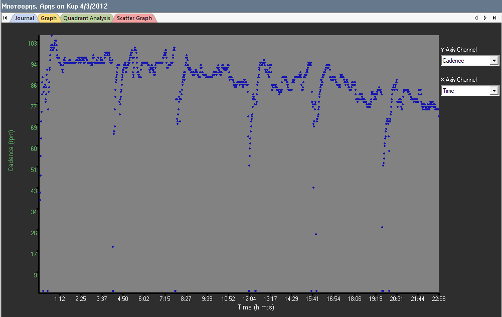 Ας δούμε στον πίνακα 1 το Scatter Graph του αθλητή Άρη Μπότσαρη, ως προς την σταθερότητα της Περιστροφής του Πεταλαρίσματός του στη διάρκεια του χρόνου, γράφημα το οποίο πάρθηκε από την ανάλυση της επίδοσής του στον συγκεκριμένο αγώνα Ατομικής Χρονομέτρησης.