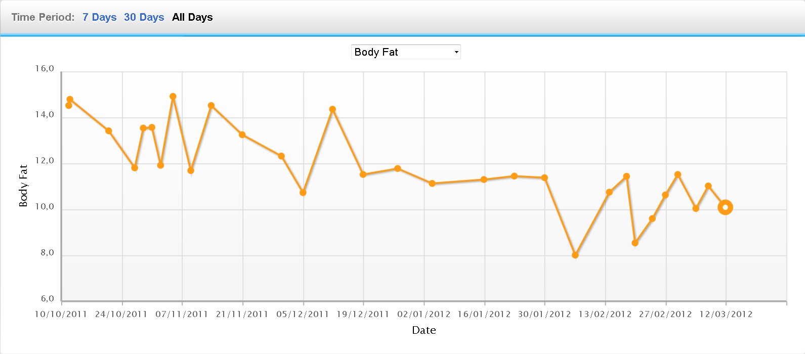 Αναλύοντας 2 φορές την εβδομάδα την συνολική σύσταση του σώματός του, συγκεντρώσαμε στα παρακάτω γραφήματα τις μεταβολές που παρατηρήθηκαν ως προς τη λιπώδη και άλιπη μυική του μάζα σε ένα διάστημα 4 μηνών.