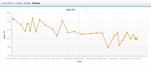 Στο γράφημα 3. υπάρχει αρκετό ενδιαφέρον, διότι βλέπουμε ξεκάθαρα την επιτυχημένη μείωση κατά 5% του γενικού ποσοστού λίπους κατά το χρονικό διάστημα που αναφέρθηκε προηγούμενα. Ξεκινώντας τη δίαιτα υπάρχει μια σταδιακή πτώση γενικού δείκτη λίπους που αφορά στο χάσιμο των γνωστών σε όλους μας “πρώτων κιλών”.