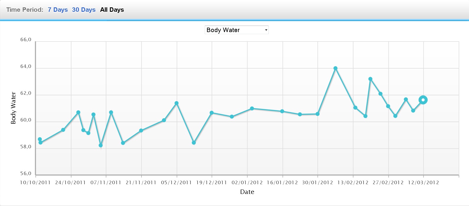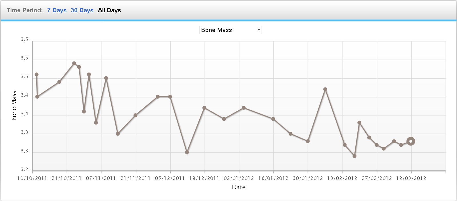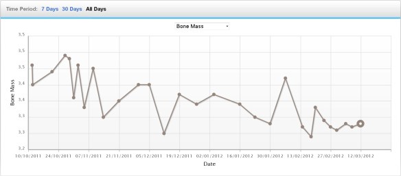 Το γράφημα της οστικής μάζας φανερώνει ένα εύρος ελεγχόμενης διακύμανσης από τα 3.3kg έως τα 3.5kg που οφείλεται στη σωστή πρόσληψη ασβεστίου και λοιπών ηλεκτρολυτών, σε συνδυασμό με την ομαλή απώλεια των κιλών (0.5kg ανά εβδομάδα).