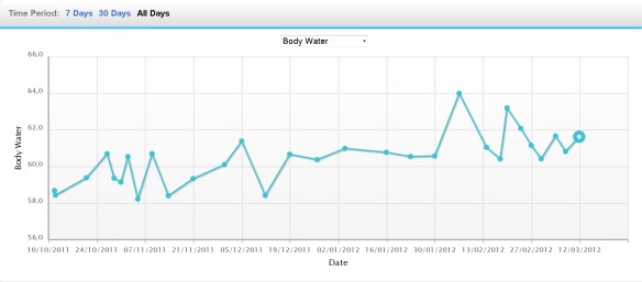 Ας δούμε τώρα στο γράφημα 2. πως μεταβλήθηκε το νερό στον οργανισμό του. Βλέπουμε ότι παρόλο που ξεκίνησε με ποσοστό υγρασίας στο σώμα του 58% (μερικά αφυδατωμένος), καταφέραμε κατά την διάρκεια της δίαιτας και με την κατάλληλη καθημερινή ενυδάτωσή του να βελτιωθεί πάνω από το 60%.