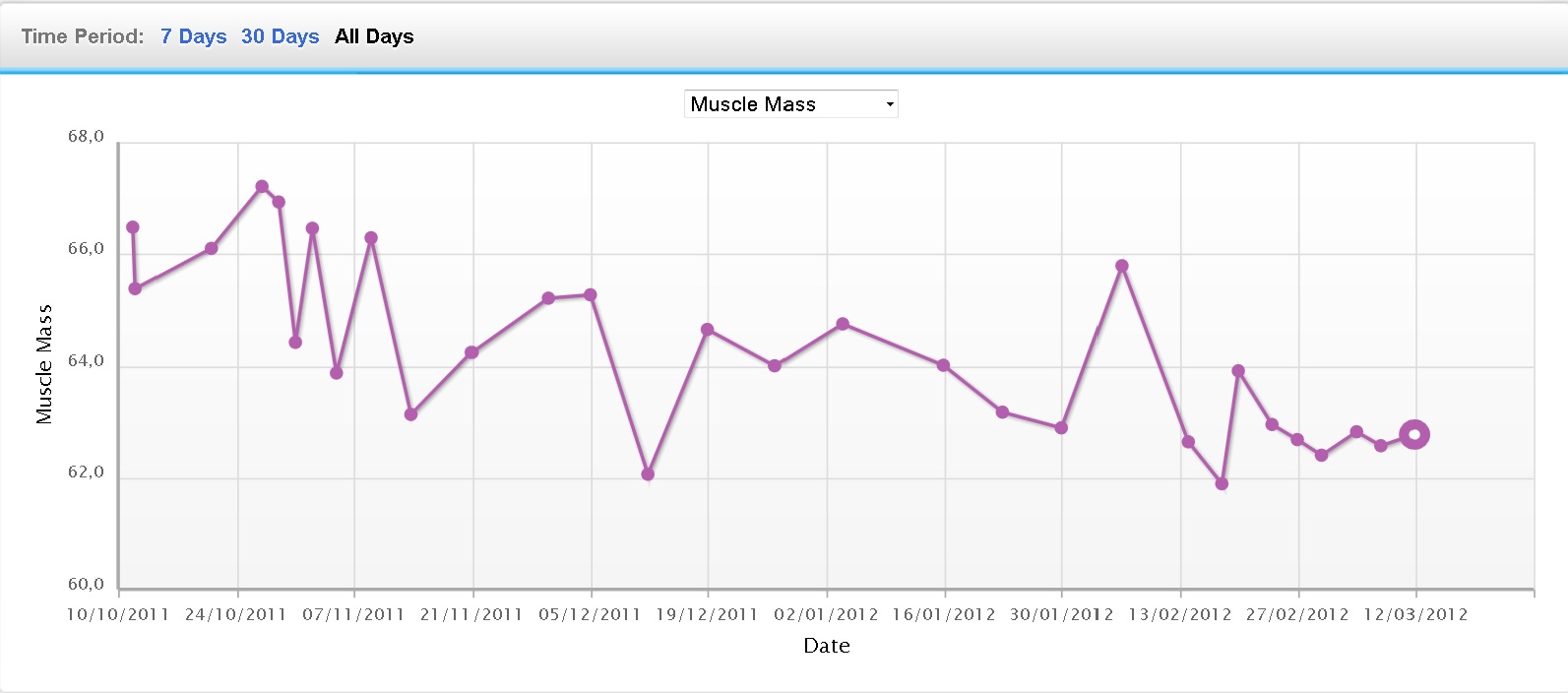 Στο γράφημα της μυικής μάζας υπάρχει πάλι μία φυσιολογική διακύμανση από τα 66.2kg έως τα 63.3kg με συνολική απώλεια 2.9kg. Το μεγαλύτερος ποσοστό της απώλειας αυτής αφορά στην εσκεμμένη ελάττωση του μυικού ιστού στην περιφέρεια του άνω κορμού, διότι αποτελεί περιττό βάρος για αθλητές ποδηλασίας αντοχής.