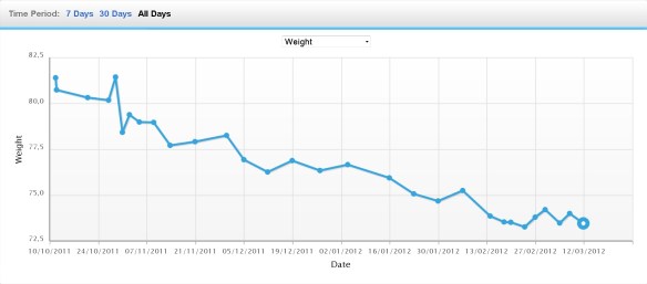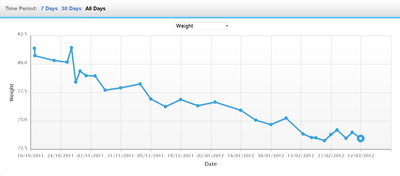 Στο γράφημα 1. παρατηρούμε τον ρυθμό μείωσης του σωματικού του βάρους. Τα κιλά του μεταβλήθηκαν από 81.5kg σε 73.5kg στο χρονική περίοδο των 4 μηνών δηλαδή, στο επιτρεπτό όριο των 0.5 κιλών ανά εβδομάδα.